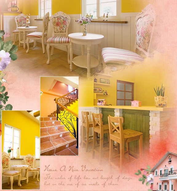 輕推那扇白色鍛花鑄鐵大門,眼前一座兩層樓高的粉紅色主屋搭配純白色的玻璃帷幕餐廳,民宿為獨棟式建築並擁有寬廣的視野與前後超大180坪的庭院綠草皮,與鄰近翠綠山嵐相互融和, 四周圍繞著主人家自行嫁接的各個品種樹玫瑰。各房間都是男主人親自手繪設計,如:鍛花床板打造浪漫華麗風的「夢境」房型,贈送給熱愛藝術與美學的女主人,此外將名畫意境與客房風格相互搭配,每間都好精采迷人。