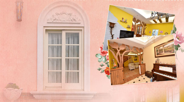 輕推那扇白色鍛花鑄鐵大門,眼前一座兩層樓高的粉紅色主屋搭配純白色的玻璃帷幕餐廳,民宿為獨棟式建築並擁有寬廣的視野與前後超大180坪的庭院綠草皮,與鄰近翠綠山嵐相互融和, 四周圍繞著主人家自行嫁接的各個品種樹玫瑰。各房間都是男主人親自手繪設計,如:鍛花床板打造浪漫華麗風的「夢境」房型,贈送給熱愛藝術與美學的女主人,此外將名畫意境與客房風格相互搭配,每間都好精采迷人。
